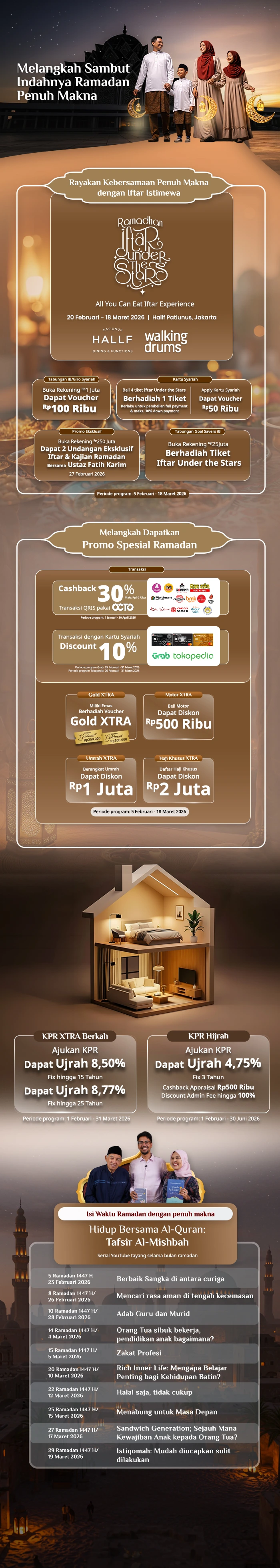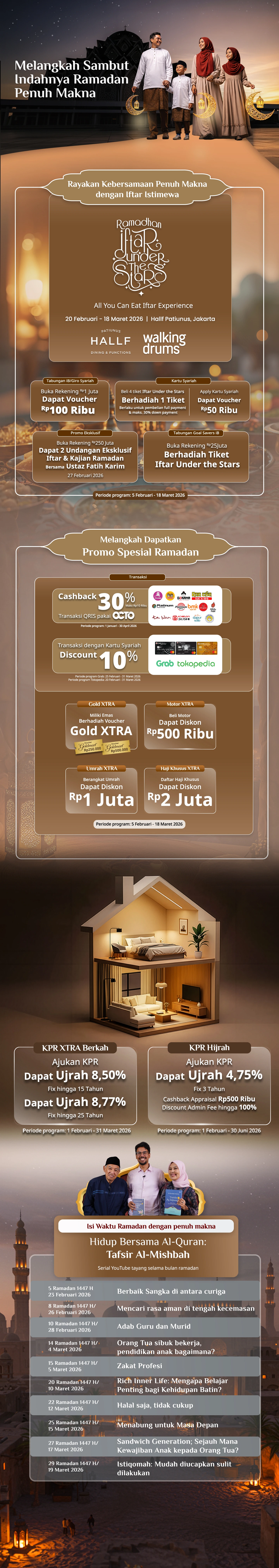 | Buka Rekening Rp250 Juta Dapat 2pax Tiket Exclusive Iftar Under The Stars by CIMB Niaga Syariah | Pembukaan rekening Tabungan Berjangka Syariah (Goal Savers iB)/ WM iB/ Bancassurance Syariah dengan setoran awal minimal Rp 250.000.000, - dan setoran bulanan minimal Rp 100.000, -/bulan, jangka waktu selama 1 (satu) tahun akan mendapatkan hadiah 2 voucher ifthar. Dalam 1 CIF maksimal mendapatkan 4 voucher ifthar. Khusus untuk program iftar 27 Februari 2026. |